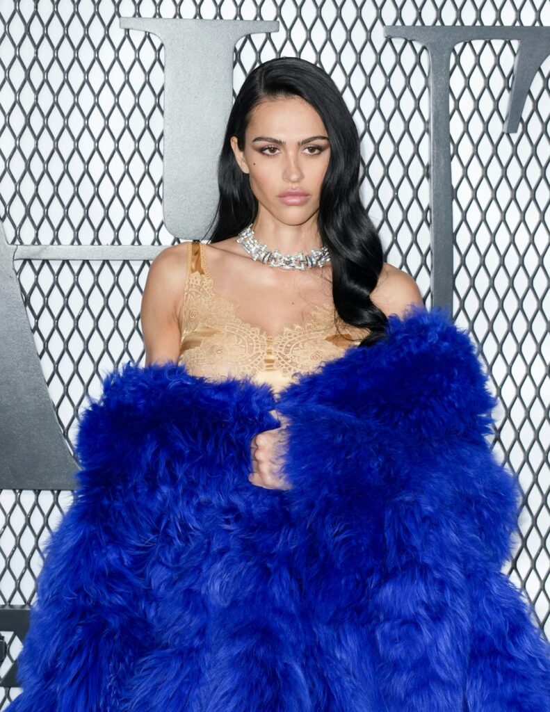 At ‘The Beauty’ premiere, the model styled a simple slip dress with a vibrant shearling coat.