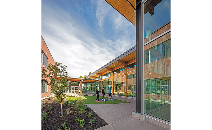 Equipped with 145 rooftop photovoltaic solar panels, this 11,200-sq-ft fully electric wellness center is a net-positive energy facility.