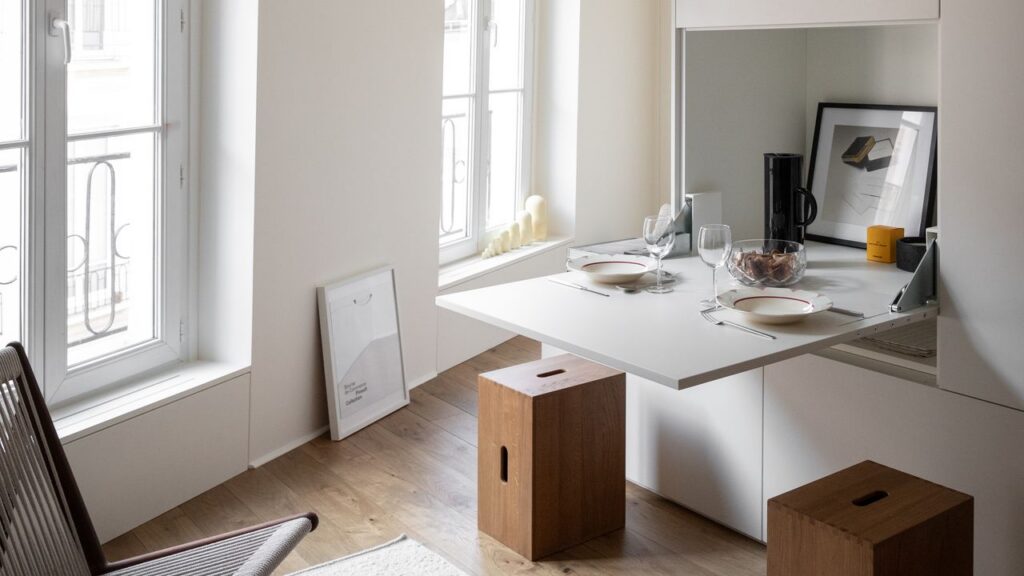 A dining table hidden in a wall, a step used as a bench, a sculptural partition that redefines space, and more ingenious hacks straight out of Parisian small spaces