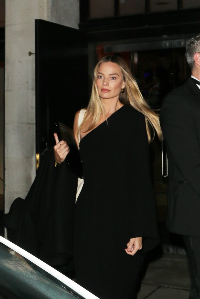 At a gala in London, the ‘Wuthering Heights’ star embraced monochrome layers.