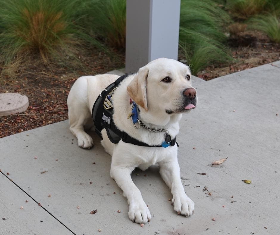 The English Labrador was originally raised as a guide dog and now serves as a certified therapy dog.